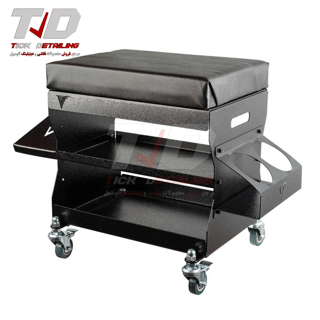 صندلی دیتیلینگ V Guard مشکی با چرخش 360 درجه و نگهدارنده ابزار، راحتی و کارایی شما در کارگاه دیتیلینگ را افزایش میدهد.